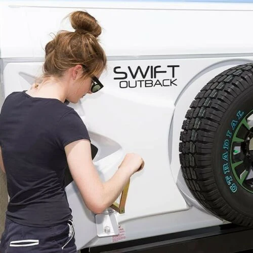 This small plastic door is used to cover where the winch handle enters the camper trailer body to engage the winch.